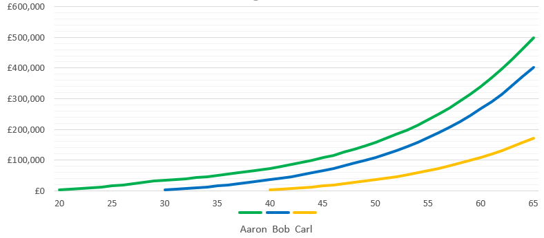 It’s a bit sad for Bob and Carl. They’d saved so much more but don’t manage to acquire anything like as much. That is simply because they didn’t start early enough. In fact, if Aaron had carried on saving £2000 each year until he was 65, he would have saved £90,000, that in turn, would be worth £835,000 by the time he was 65! Almost ten times as much!