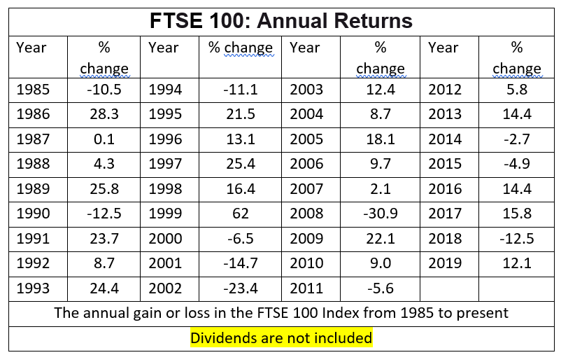 This table shows you how much the UK stock market has gone up and down in the last 25 years