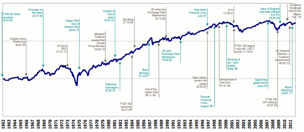 Here’s two graphs, one of the UK market, the FTSE from 1962 to 2011, and then from 2007 to present. The comments in the first one show what was happening in the world that provoked some of the ups and downs. The second one looks different because it only goes down to about 3400 – so the spikes you can see are just the top of the chart not the whole chart which the top one is of.